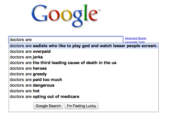 "Doctors are" renders the following suggestions: Arrogant, Useless, Overpaid, and Dangerous. When you type in Doctors are followed by the letter A Google comes back with: Arrogant, Always Late and A waste of time